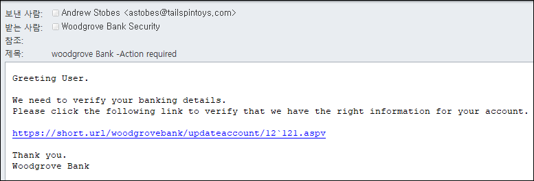 실제 배달된 ksyou@softwareone.co.kr의 Outlook을 보면 아래와 같이 받는 사람은 Woodgrove Bank Security 보낸 사람은 andrew stobes로 확인됩니다. 실제 보낸 사람과 받는 사람의 정보가 완전히 틀리게 표시 되는것을 확인할 수 있습니다.